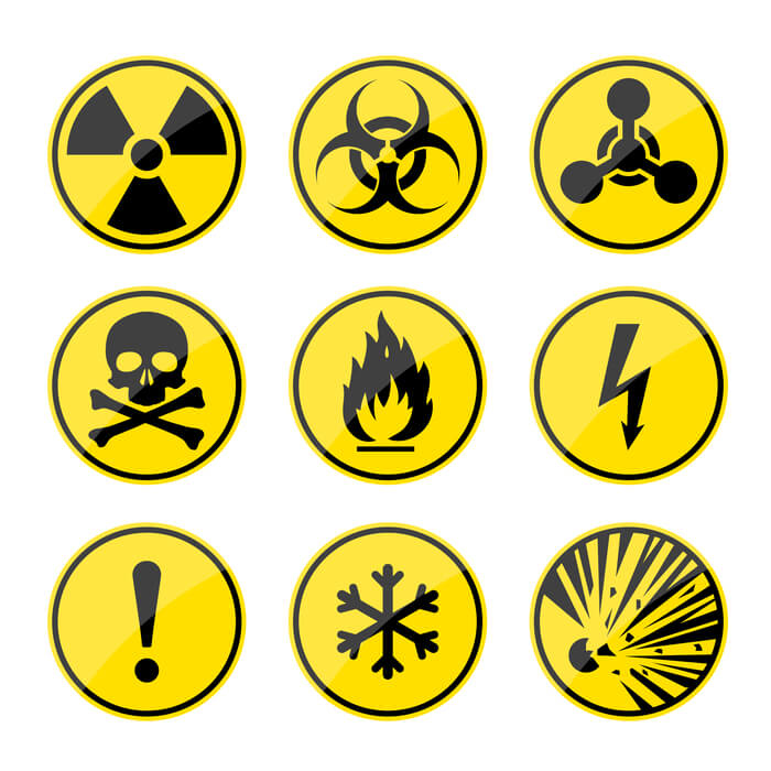 Simbol-simbol keselamatan kerja ini digunakan untuk mengidentifikasi zat atau bahan kimia yang berpotensi berbahaya, seperti bahan yang mudah terbakar, kimia yang termasuk dalam kategori zat beracun, gas, atau bahan kimia yang memiliki sifat korosif.