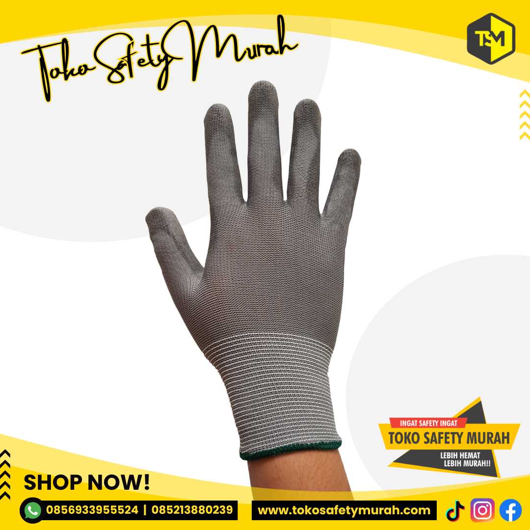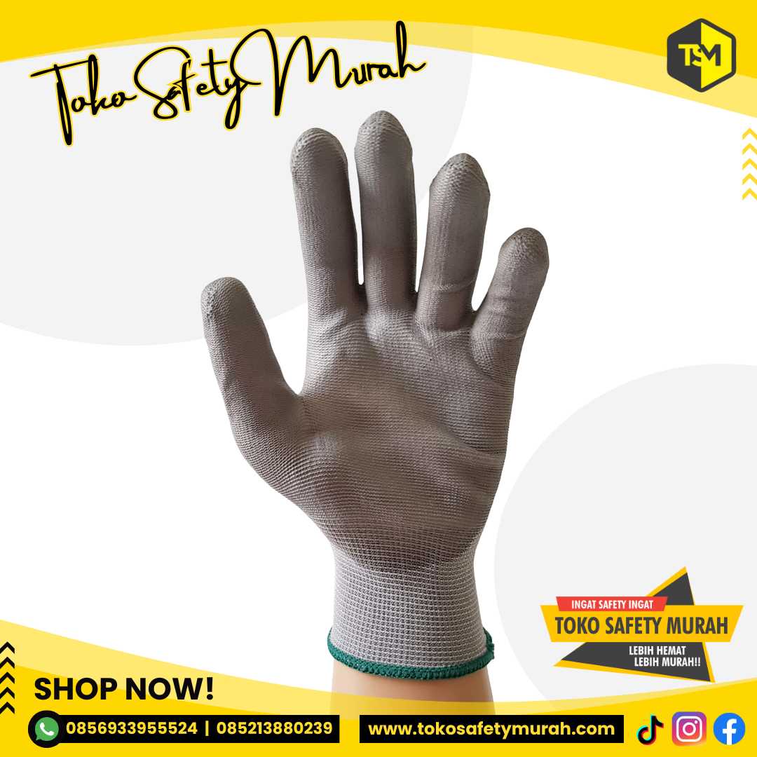 Sarung Tangan PU Coating Palm Fit Safety Glove Antislip Nylon Polyster Warna Abu Abu Grey Polyester